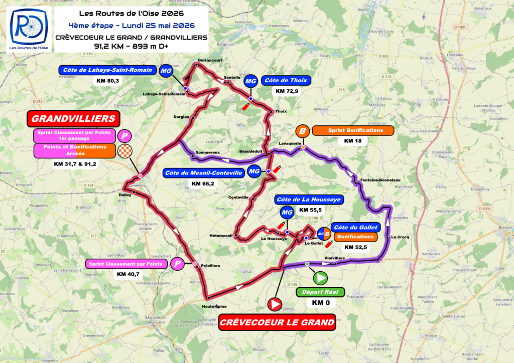 Parcours 2026 La 42ème édition des Routes de l’Oise, ce sera : 4 étapes (dont 1 contre-la-montre), 6 villes étapes, 73 communes traversées, 285 kms de course et 2482 m de dénivelé positif ! Étape 1Étape 2 (CLM)Étape 3Étape 4 BEAUVAIS / MAIGNELAY-MONTIGNY Télécharger en GPX Télécharger en PDF Vue interactiveProfilCarteHoraires FEUQUIERES / FEUQUIERES Télécharger en GPX Télécharger en PDF Vue interactiveProfilCarteHoraires FORMERIE / FORMERIE Télécharger en GPX Télécharger en PDF Vue interactiveProfilCarteHoraires CREVECOEUR LE GRAND / GRANDVILLIERS Télécharger en GPX Télécharger en PDF Vue interactiveProfilCarteHoraires